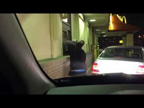 The drunk idiot below apparently got so pissed that his change was accidentally dropped on the ground that he thought he would take it out on the McDonald’s drive-thru worker by attempting to fight him. Take a look at how this guy got his ass beat even while the employee had half of his body in the fast food place, and the other half outside of it.