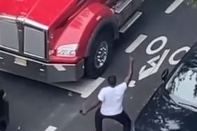 It all kicked off when a hefty truck driver was apparently cut off by the driver in the small gray car. Well, that didn’t sit well with the truck driver because he quickly gets out of his truck and makes his way towards the car and begins punching the driver through the open window.