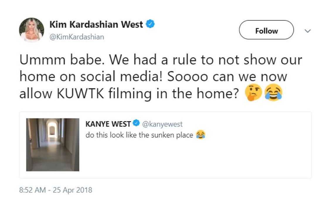 In April of 2018, Kanye tweeted a pic of his home with Kim. Referencing the film Get Out, he wrote, “do this look like the sunken place,” alongside a laughing emoji. Kim retweeted his post, saying, “Ummm babe. We had a rule to not show our home on social media! Soooo can we now allow KUWTK filming in the home?” It’s hard to believe these two had “rules” about anything being off-limits – and now we can see why they wouldn’t bother.