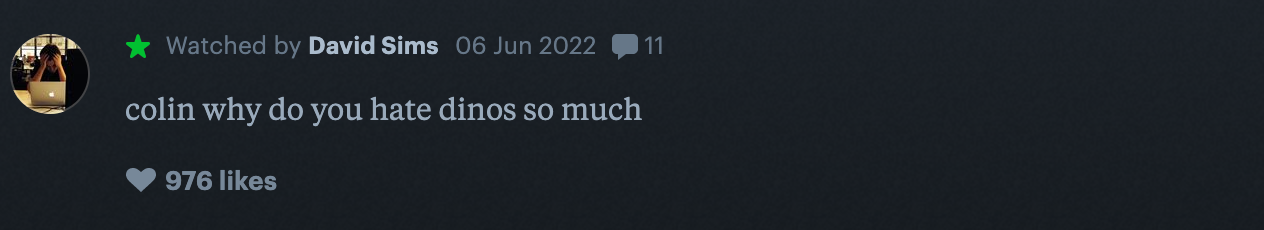 Dominion currently holds a 30 percent critical rating, which is by far the lowest of any movie in the franchise thus far. But as the users of the platform Letterboxd.com make us astutely aware, Dominion might be the second-worst thing to ever happen to dinosaurs.