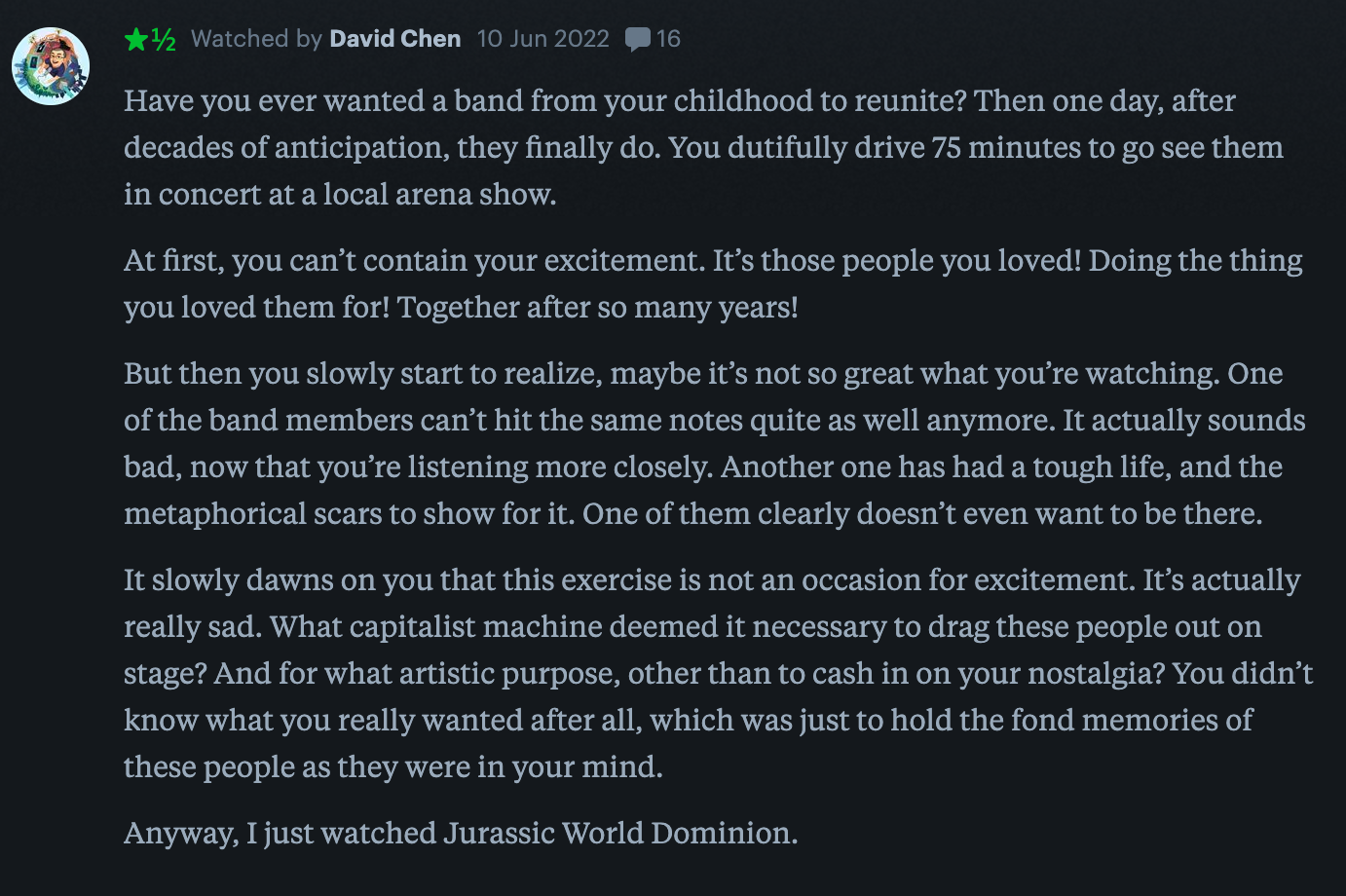 In the latest edition of Honest Movie Reviews, we’re pulling together the funniest audience movie reviews on the internet. From funny to ironic, truthful to the downright silly, we’re diving into the deep, dark rabbit hole of online movie fandom. Today, we turn our attention to Jurassic World: Dominion.