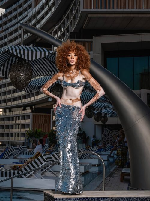 Winnie Harlow, in her bikini bra top outfit, appears to have done this mini photoshoot at the Atlantis The Royal in the United Arab Emirates. Every image has been captured with a stunning background view of the Palm Jumeirah area.