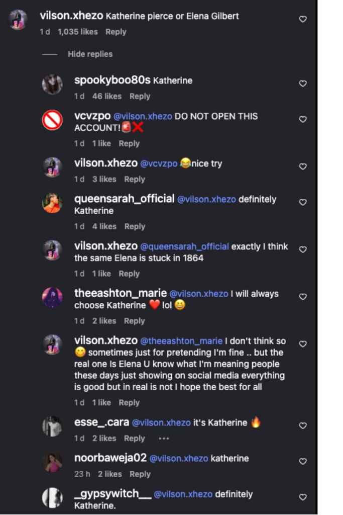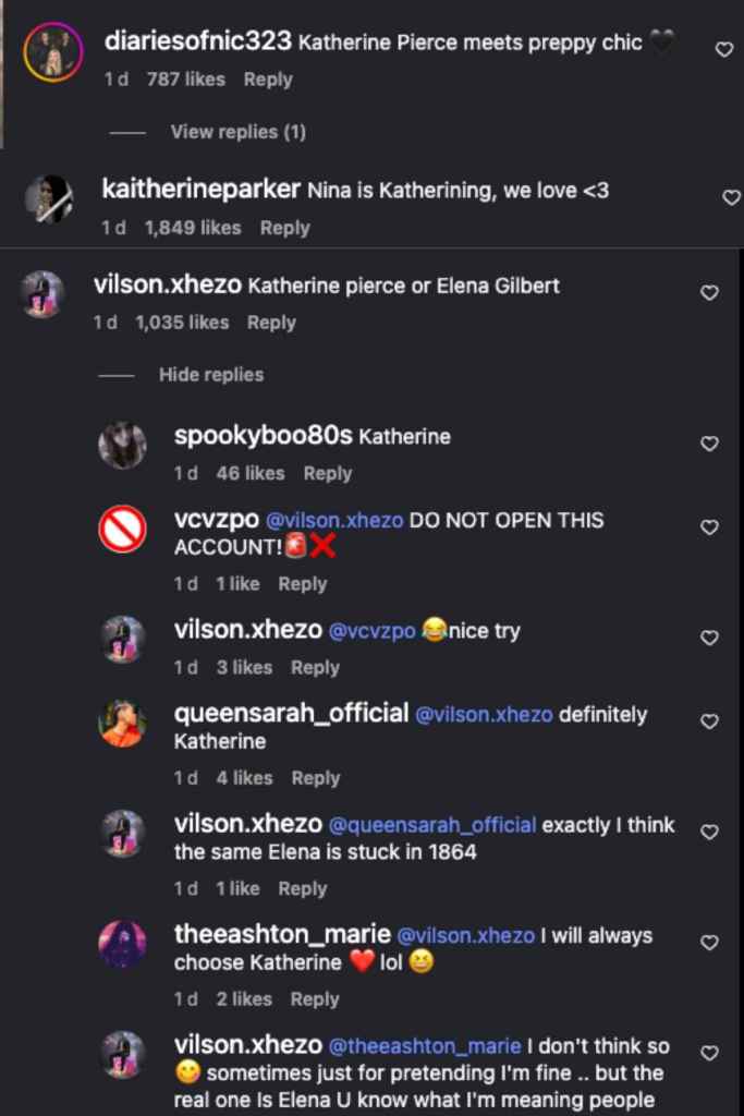 Reactions poured in on Instagram comments: One fan wrote, “Nina is Katherining, we love <3.” Another exclaimed, “Katherine Pierce meets preppy chic.” A user also asked, “Katherine Pierce or Elena Gilbert,” to which a fan replied, “Katherine.”