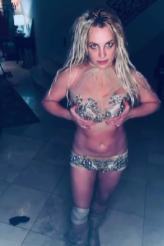 Britney Spears wore mini shorts in her recent Instagram video. Her outfit featured a neutral skin-toned color of cream adorned with sparkling designs all over it. The low-waisted shorts showcased the “Gimme More” singer’s toned midriff.