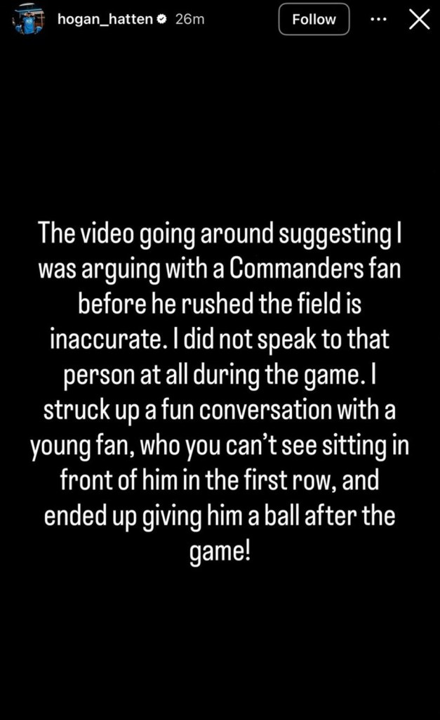 “The video going around suggesting I was arguing with a Commanders fan before he rushed the field is inaccurate. I did not speak to that person at all during the game. I struck up a fun conversation with a young fan, who you can’t see sitting in front of him in the first row, and ended up giving him a ball after the game!”