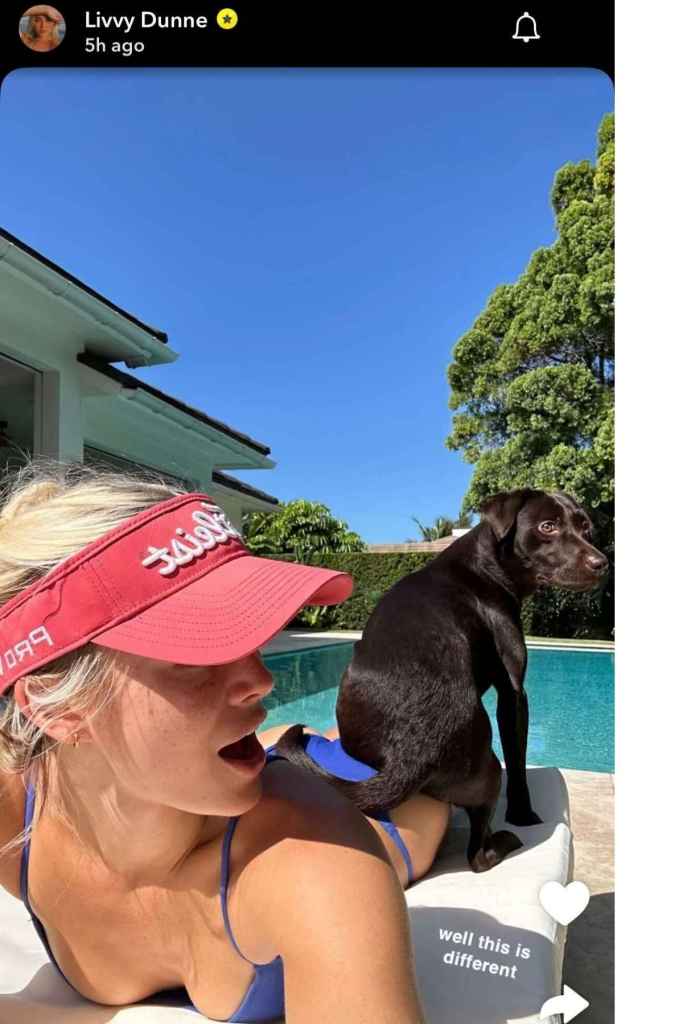 Livvy Dunne’s wild poolside photos shows her sunbathing in bikini with dog on back