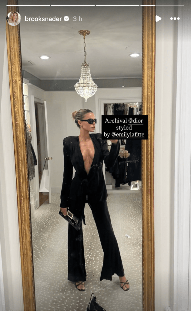 Her oversized black sunglasses stayed indoors for that fashion-first finish look. The mirror selfie she posted on her story came from a boutique-style dressing room with racks, chandelier lighting, and a gilt full-length mirror. The on-screen caption read: “Archival @dior — styled by @emilylafitte.”