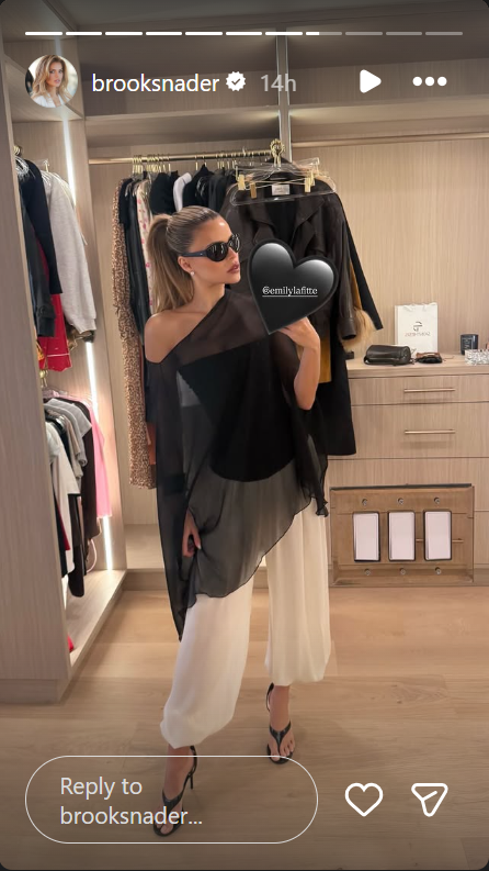 In her Instagram story, Brooks Nader wore a black strapless top with sheer fabric draped loosely around her silhouette. The multilateral drape contributed to the movement. It elevated the outfit without appearing to make much effort. Nader combined it with loose, long-legged white pants that perfectly complemented the sheer top, adding lightness and modernity to the outfit.