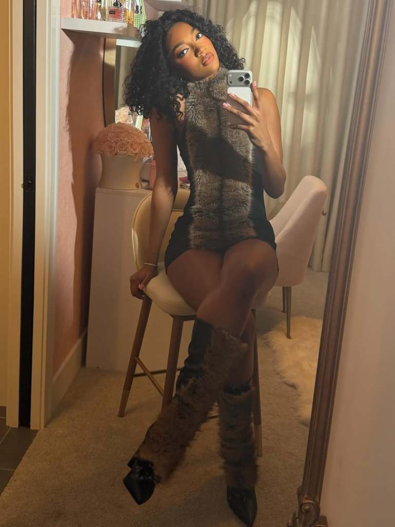 As seen in the above photos, Reese’s mini-dress has a black cotton fabric on the sides and a brown fur fabric in the middle that reaches and covers her neck. She paired the dress with matching boots. Notably, in two photos, in which she can be seen posing on a bedroom bench, she wears a long black fur coat.
