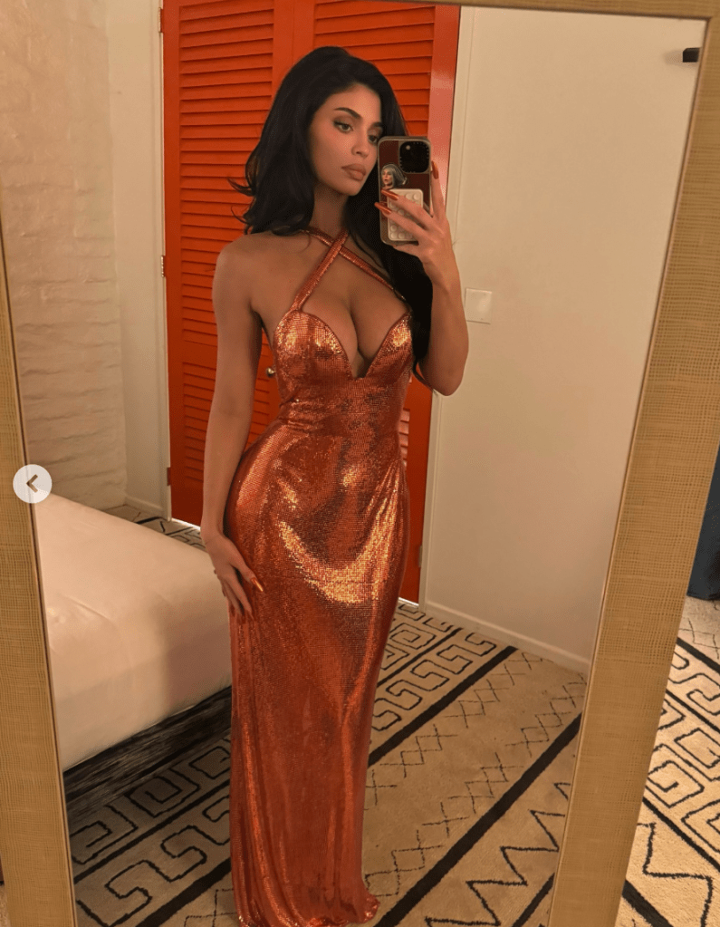 Kylie Jenner has shared yet another stunning fashion look, this time rocking a shimmery orange gown. The socialite and makeup magnate recently posted an Instagram carousel to show off the exquisite ensemble. The photo dump includes three mirror selfies where Jenner is striking some fun poses to capture the glamorous design on camera.
