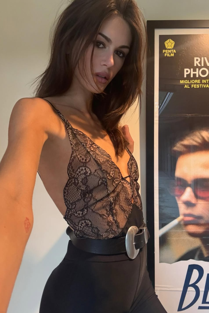 In a recent Instagram post, Gerber wore a sleek black lace top with a deep cut that looked lightly held together, giving the impression that the outfit is almost at the mercy of a single thread. The lace is delicate and sheer, paired with high-waisted black bottoms that add structure to the look. A wide black belt with a bold silver buckle cinches the waist and balances the softness of the lace.