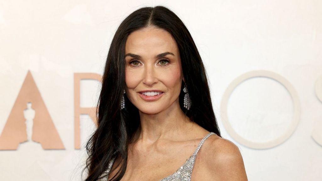 Demi Moore sparkled in a tiny strapless Gucci minidress. The piece was covered in shimmering silver sequins. It caught the light from every angle. The dress made her look like a human disco ball. She paired the tiny mini with sheer black tights from the same brand. This added a sophisticated, winter-ready touch.