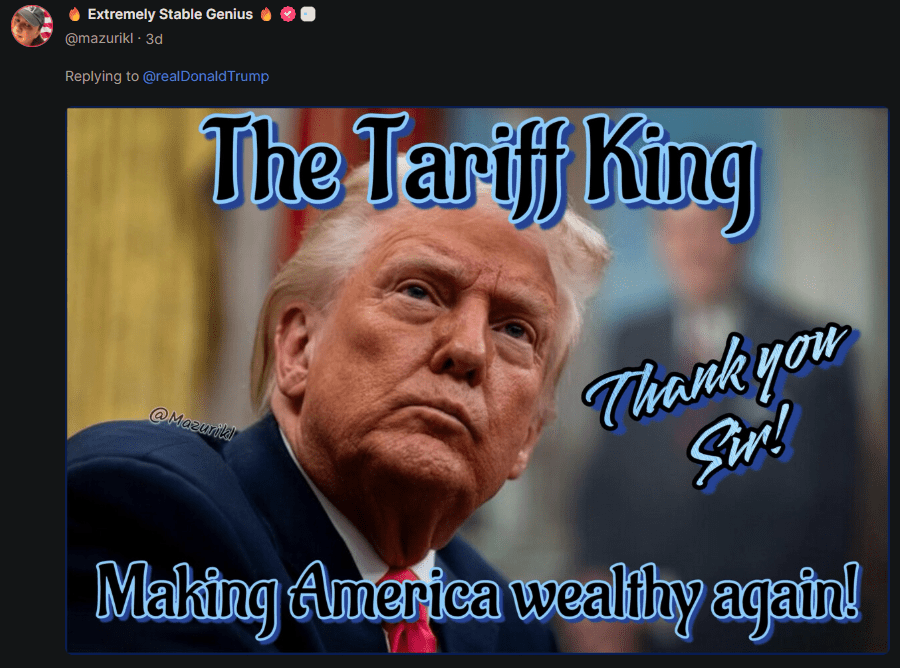 Another commenter posted a photo of Trump with “The Tariff King” text and “Thank you, sir!” as well as the phrase “Making America wealthy again!”