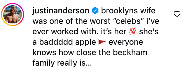 In the exchange, Anderson reportedly described Peltz as a “bad apple” and claimed she was “one of the worst celebs” he had ever worked with, statements that quickly circulated online. He allegedly doubled down later via his Instagram Stories, saying he felt uneasy when he learned Brooklyn Beckham and Peltz were getting married and suggesting that he believed the union would cause strain within the famously close-knit Beckham family.