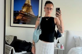 The top has a dark, ribbed pattern that adds detail to the simple look. Tyla pairs it with dark, low-rise denim jeans that appear unbuttoned. A thin, delicate body chain drapes across her midriff. She also wears a small belly button piercing and a delicate bracelet.