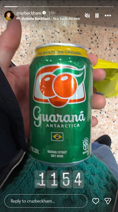 On January 22, Cruz Beckham shared two cryptic Instagram Stories that appeared to reference his mother, Victoria Beckham. In the first post, he uploaded a photo of himself holding a can of Guaraná Antarctica with the song “I’m Not Such an Innocent Girl” by Victoria Beckham playing in the background. Victoria originally released the track in 2001. Cruz did not include a caption or explanation with the post.