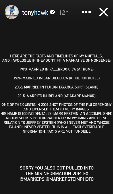 Hawk explained how his 2006 Fiji destination wedding became tangled in the Epstein rumor. “One of the guests in 2006 shot photos of the Fiji ceremony and licensed them to Getty Images,” Hawk stated. “His name is [coincidentally] Mark Epstein,” he added. Hawk was quick to clarify about the photographer. He said he is “an accomplished action sports photographer from Wyoming and of no relation to Jeffrey Epstein (who I never met and whose island I never visited).”